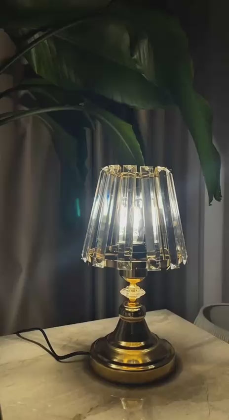 El işçiliği kristal detayları ve parlak altın gövdesiyle ortama anında zarafet katan bu masa lambası, ışığı kırarak büyüleyici bir parlama etkisi oluşturur.